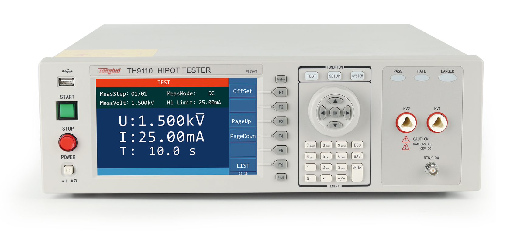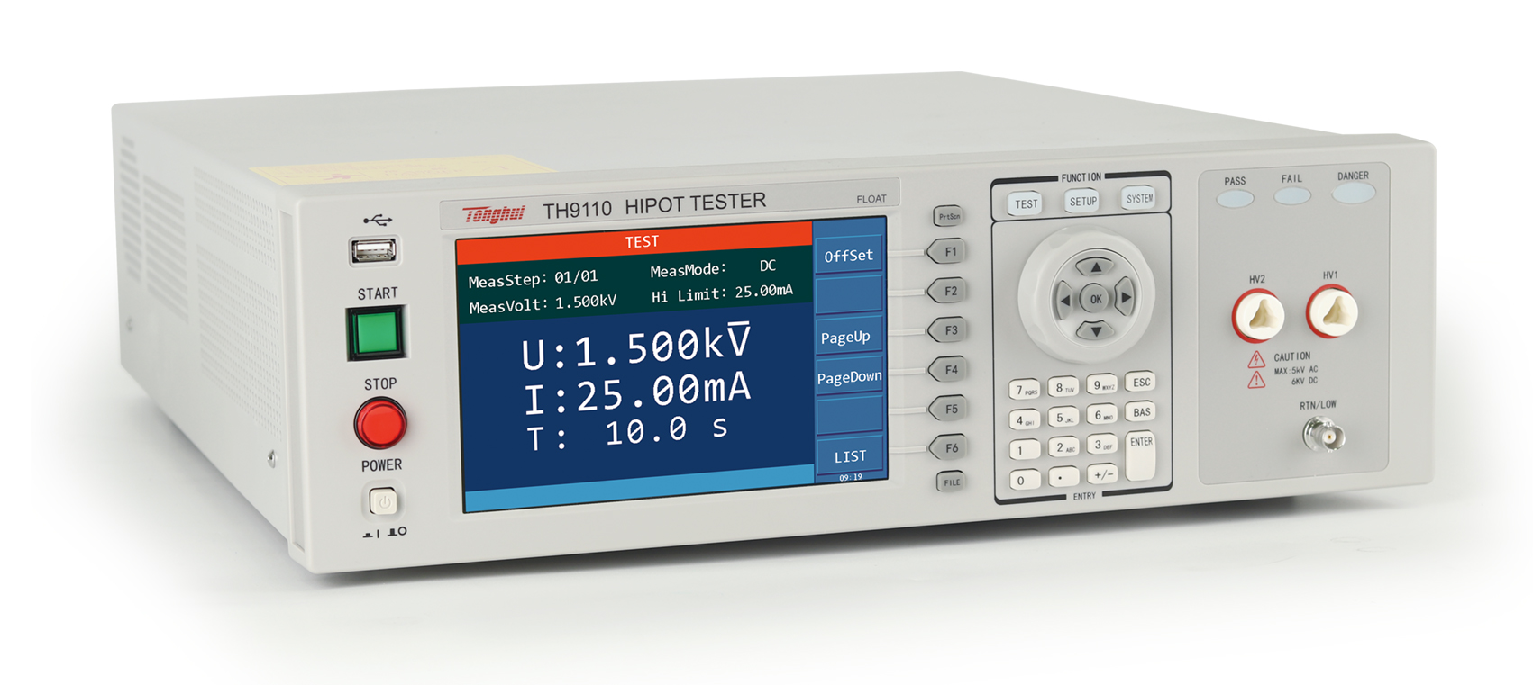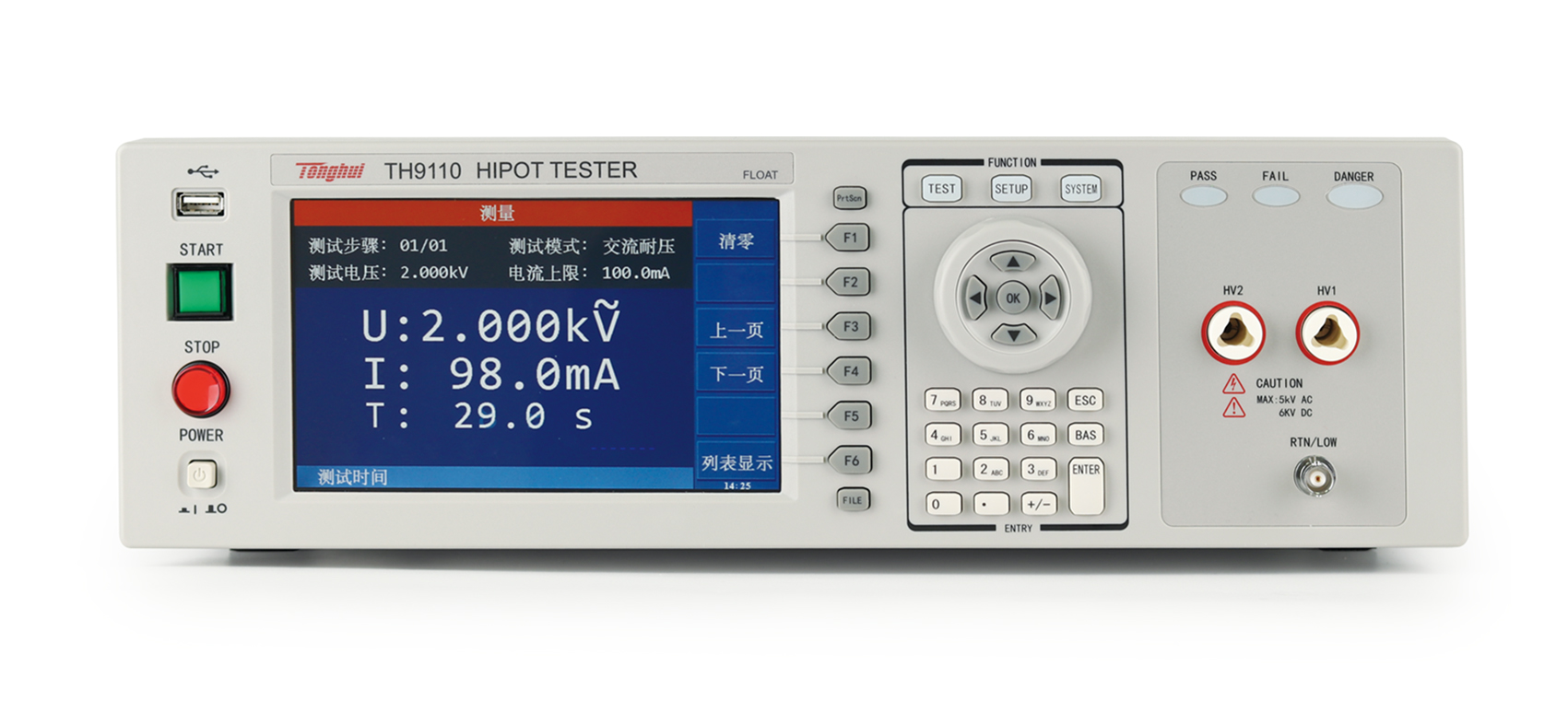 • ?TH9110/TH9110A是集同惠多年電氣安規測試儀的設計經驗,新推出的具有500VA功率,最大輸出交流5kV/100mA的新一代交直流耐壓/絕緣電阻測試儀,符合大功率耐壓測試需求,符合EN50191的設備安全標準。TH9110/TH9110A系列除了基本的交流、直流、絕緣電阻測試外,增加了崩潰電壓測試功能,可分析產品的擊穿點電壓,滿足特定客戶對產品高壓可靠性檢測的要求; 具有開短路檢測功能,解決了用戶在測試安規產品時的可靠性和準確性問題,輸出時同步進行接觸檢查,避免漏檢,提升測試可靠度與效率。TH9110/TH9110A使用7寸LCD彩色顯示器,測試結果用大字符顯示,更加清晰直觀,方便操作與判斷。高壓浮動輸出設計、觸電保護功能等,確保了客戶在接觸到高壓測試端的時候也不會被電擊傷害,保證操作人員的人身安全。