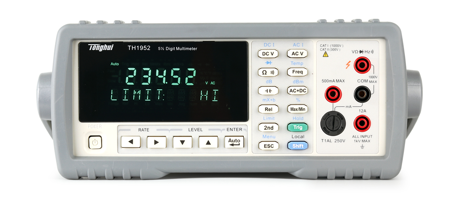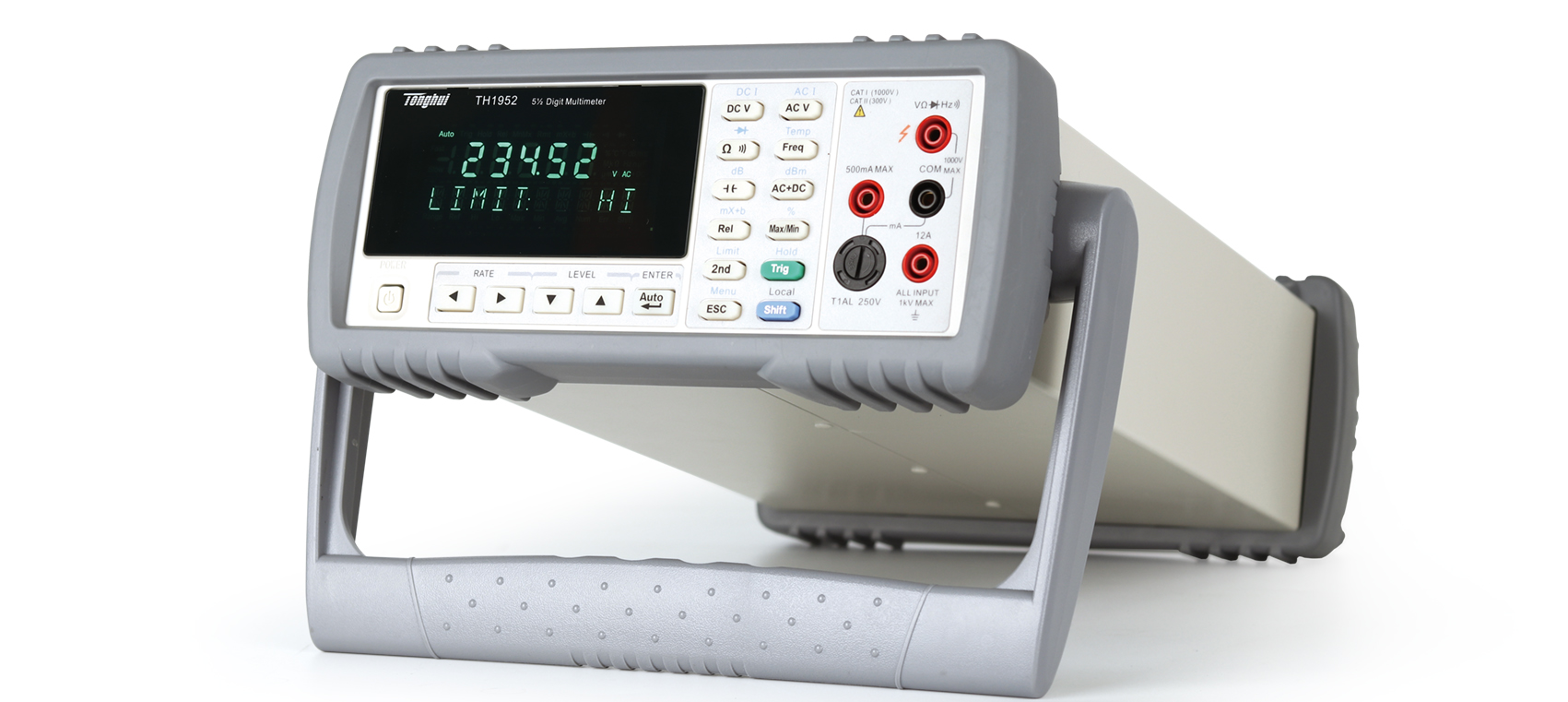 ■ TH1952型5 1/2 位真有效值數(shù)字多用表是一種多功能、物美價廉的電壓/電流/電阻/電容測試儀。儀器提供120000字的最大讀數(shù),200次/秒最大ADC采樣速度,0.02%的直流電壓準確度等一系列優(yōu)良的性能和經濟的價格為廣大客戶提供最優(yōu)的選擇。TH1952提供高亮度VFD雙參數(shù)顯示器,可以同時測量/顯示交流/直流電壓或者電流、交流電壓/電流和頻率等參數(shù),不僅大大提高了測量效率,而且測試顯示一目了然。 儀器配備了USB通訊接口,同時可以提供通用的通訊軟件以 滿足與計算機的通訊、數(shù)據(jù)分析、統(tǒng)計、構建自動測試系統(tǒng)的需要。儀器接受SCPI(編程儀器的標準命令)命令,以保證通訊軟 件的兼容性。本儀器同時提供可Handler接口,可接受外部觸發(fā)和輸出分選信號,方便生產線上的產品分選。